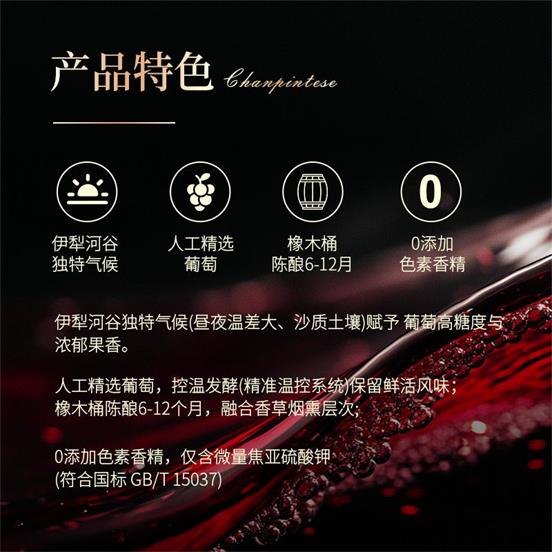 选用新疆伊犁河谷丝路酒庄赤霞珠、蛇龙珠葡萄,经进工艺控温发酵酿制而成,酒体呈宝石红色,清新的红色水果香气,伴有甘草、薄荷香,酸味佳,成熟的单宁味,留香长而紧括。
