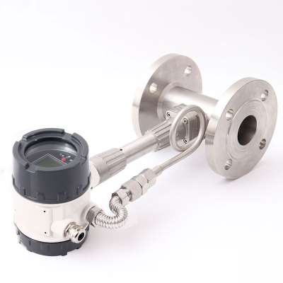 涡街流量计主要是由传感器(内有放大板)、连杆、漩涡发生器组件(内有三角柱、探头)构成,TSGD7006流量计可用于过热蒸汽、饱和蒸汽、压缩空气和一般气体的测量。在本测量系统中,涡街流量传感器安装在垂直管道上,它将与高压风流量相对应的脉冲信号发送给智能流量积算仪。智能流量积算仪采用的单片机技术,可配合IC卡预付费流量计或孔板流量计进行流量测量,它具有全中文液晶显示屏,可以显示瞬时流量、瞬时热量、累计流量、累计热量、涡街频率、介质压力温度、密度、时间和日期等多种信息,还具有小流量自动补偿、停电流量补偿、自动抄表等丰富的功能。接入温度压力信号还可以自动进行温度压力补偿。它将来自涡街流量计的脉冲信号转换为瞬时流量并进行累积用于就地显示,并输出一个与瞬时流量成正比的4~20mA的信号,以方便同PLC或DCS的连接。上海计量测试研究所开发了耐高温应力式涡街流量计的检测元件等,这些研究开发项目都取得了高水平成果。国内的一些企业,对涡街流量计也情有独钟,通过技术转让或合作开发的形式,加人涡街流量计的开发、生产行列,在测量蒸汽的管道中,为了防止转换器温度过高,仪表连接杆至少一半不要保温, 为了方便观察和接线,流量计的表头在原有的位置上可进行360度旋转,在调整好位置后,把锁紧螺母拧紧即可。如果流量计的表头安装方向朝下时,须用防水胶带把琐紧螺母缠绕密封好,1908年贝纳德(Ben耐)指出了圆柱体后方尾流的周期性与旋涡的形成和排列有关。测量高温蒸汽时,保温层不能超过支架高度的三分之一