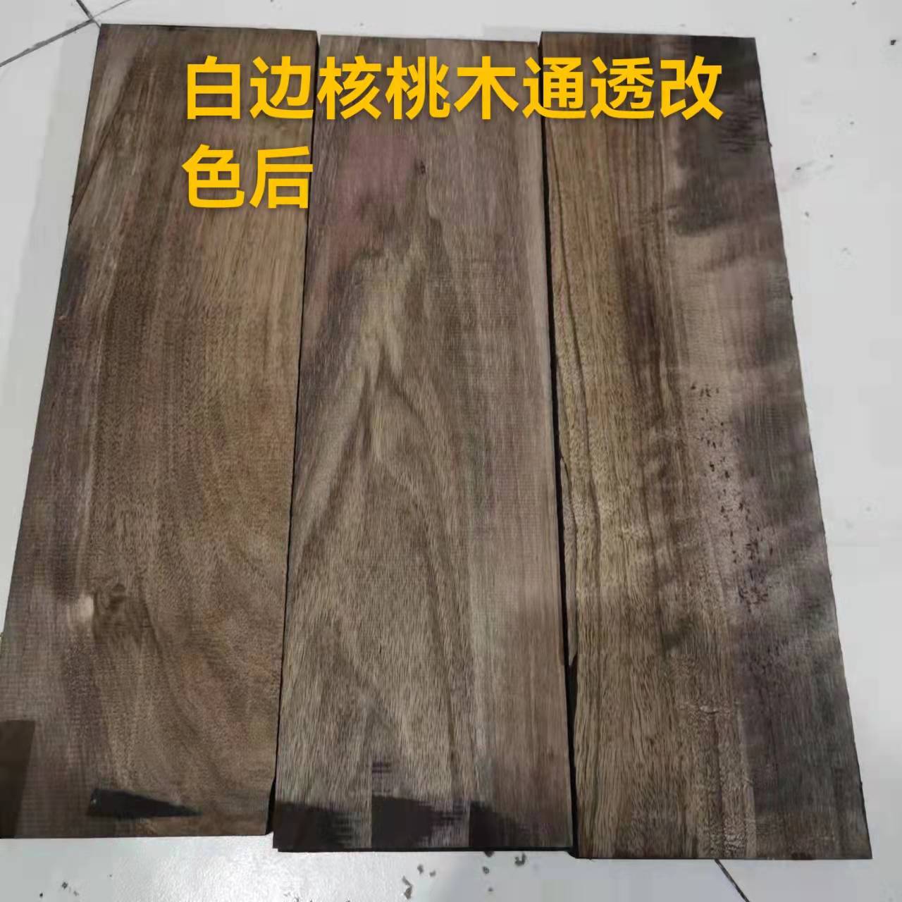 核桃木通透改色黑胡桃木是陕西优木林化木材技术研发有限公司新研发的新型木材改色技术,此技术最大的突破点是湿木材直接改色,减少木材二次烘干造成的损失,改色剂改色原理并非染料,本公司研发的改色剂是和木材单宁发生反应,所以在改出来的木材纹理通透清晰,白边严重的木材一次成色,本发明适合多种木材,所改出来的颜色胡桃色,黑胡桃色,颜色深浅可用自来水调试,适合原木加工,板材加工,家具木地板,装饰板,等更多木材领域.