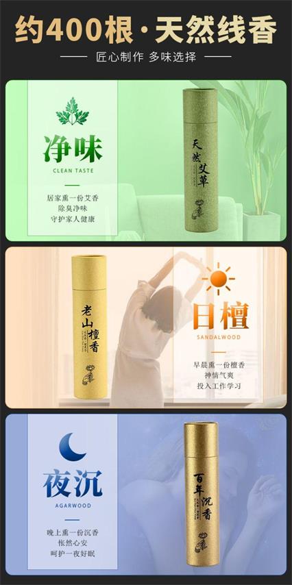 严选天然原材料,味纯质好,自然晒干,去除水分,配以天然植物粘粉原味,无化学香料,温和无害。净味选艾草香,守护家人健康;早晨熏一份檀香,投入工作学习;晚上熏一份沉香,呵护一夜好眠。
